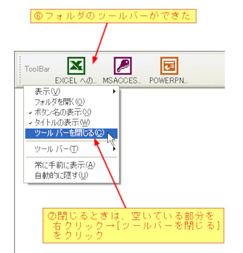 すると、フォルダがツールバーに変身します。なお、ツールバーを閉じるときは、ツールバーの空いている部分を右クリックし、[ツールバーを閉じる]をクリックします。