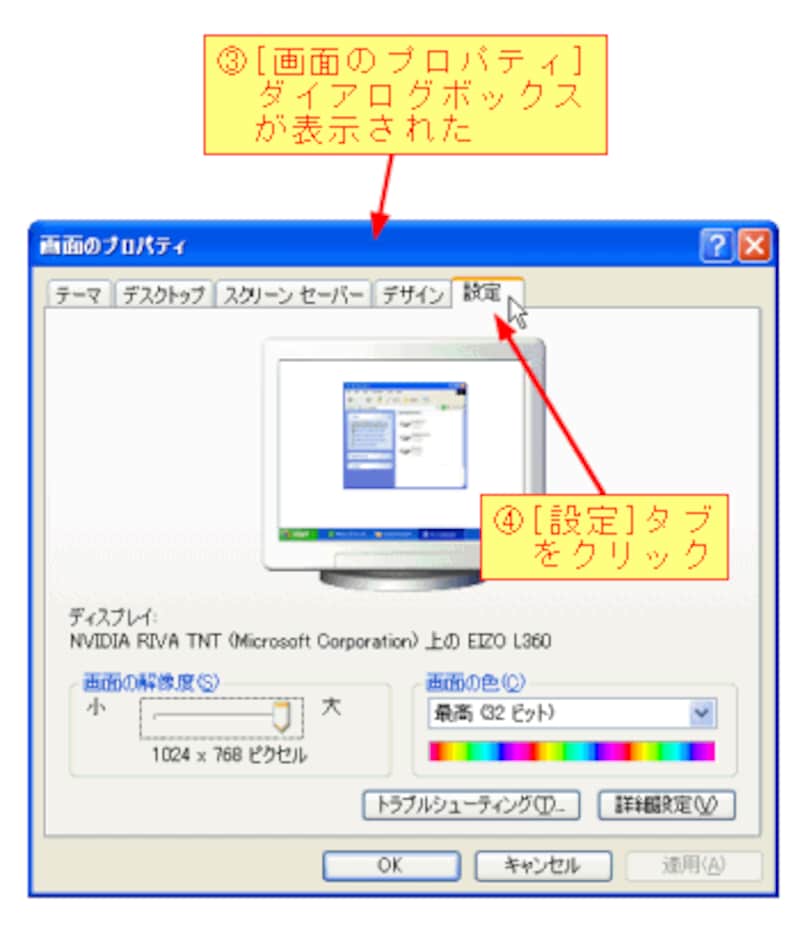 [プロパティ]をクリックすると、[画面のプロパティ]ダイアログボックスが表示されますので、[設定]タブをクリックします。