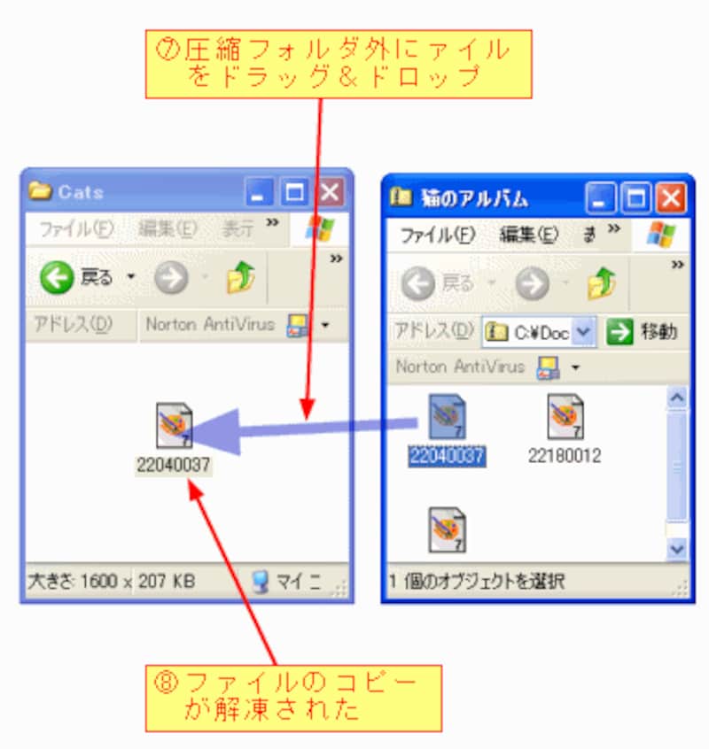 ファイルを展開するときは、圧縮フォルダ外にファイルをドラッグ&ドロップするとファイルのコピーが解凍されます。
