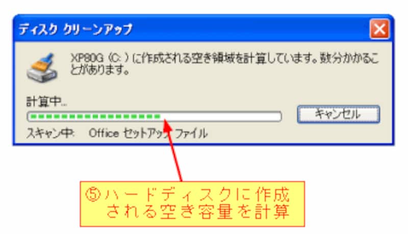 [ディスククリーンアップ]をクリックすると、ハードディスクに作成される空き容量の計算が行われます。この作業は数分かかることがあります。
