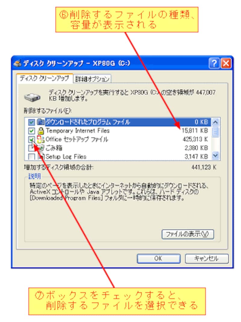 空き容量の計算が終了すると、[ディスククリーンアップ]ダイアログボックスが表示されます。ここで増加する空き容量を確認します。ファイルの前のボックスをチェックすると、削除するファイルを選択できます。