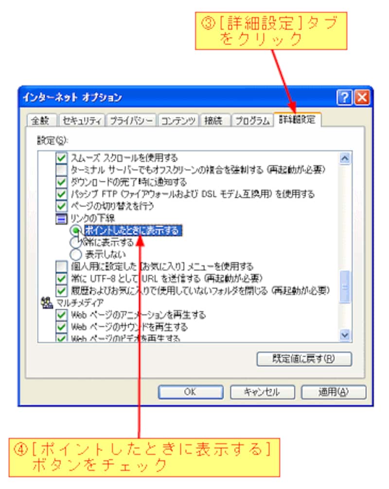 [インターネット オプション]をクリックすると、次のダイアログボックスが表示されますので、[詳細設定]タブをクリックします。続いて、[リンクの下線]項目の[ポイントしたときに表示する]ボタンをチェックします。