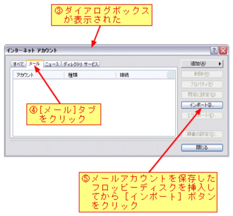[インターネット アカウント]ダイアログボックスが表示されたら、[メール]タブをクリックし、Aドライブにメールアカウントを保存したフロッピーディスクを挿入してから[インポート]ボタンをクリックします。