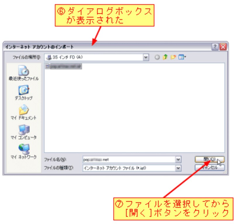 すると、[インターネット アカウントのエクスポート]ダイアログボックスが表示されますので、ファイルを選択してから[開く]ボタンをクリックします。