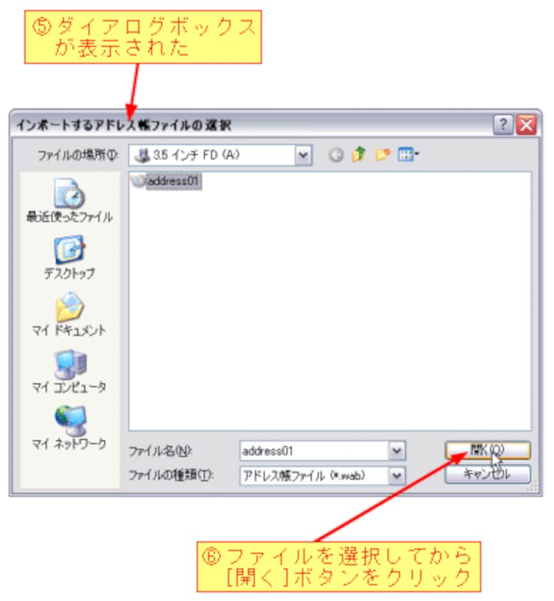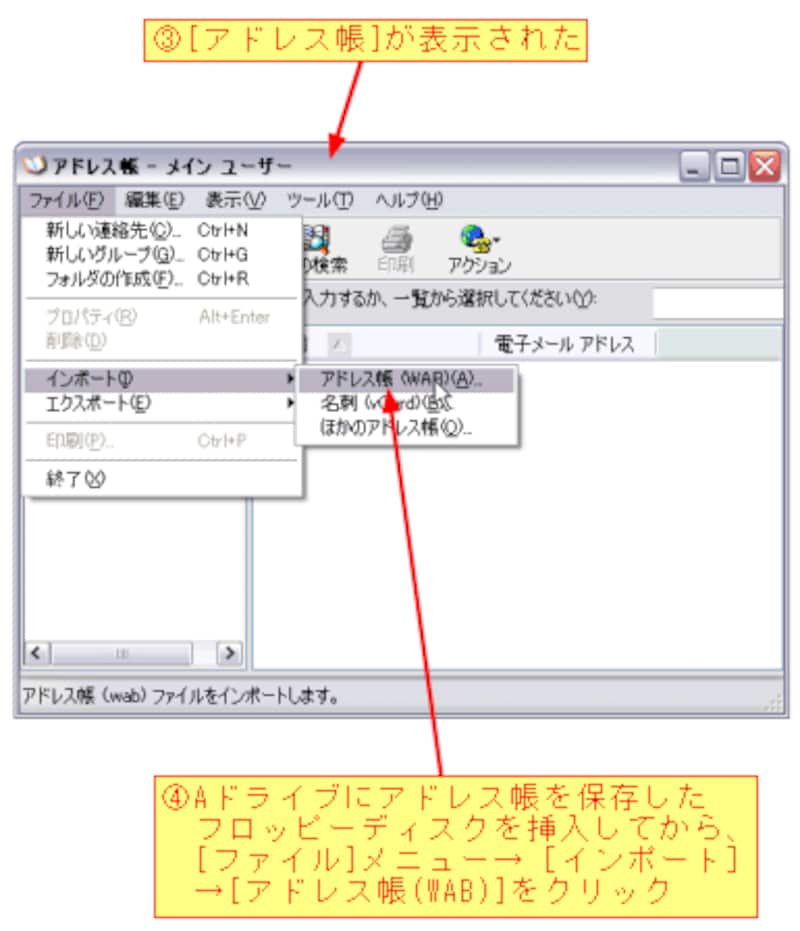 [アドレス帳]が表示されたら、Aドライブにアドレス帳を保存したフロッピーディスクを挿入してから、[ファイル]メニュー→[インポート]→[アドレス帳(WAB)]をクリックします。