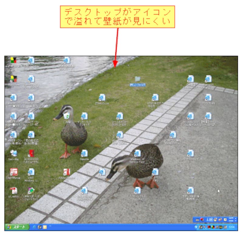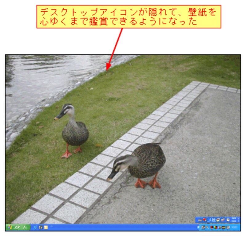 壁紙を心ゆくまで鑑賞したいとき、デスクトップアイコンは目障りです。また、デスクトップがアイコンで溢れていると、机の上が散らかっているようで、何か落ち着きません。アイコンを隠して気分をスッキリさせましょう。
