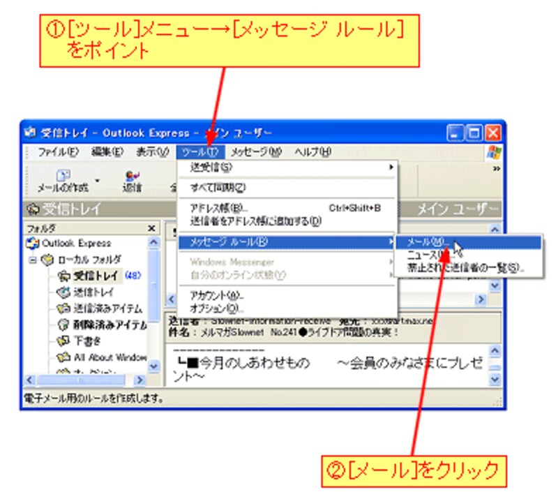 メッセージ ルールを設定するには、[ツール]メニュー→[メッセージ ルール]→[メール]をクリックします。