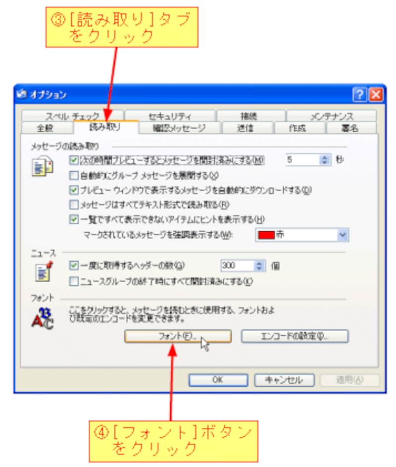 [オプション]をクリックすると、[オプション]ダイアログボックスが表示されます。続いて、[読み取り]タブにある[フォント]ボタンをクリックします。