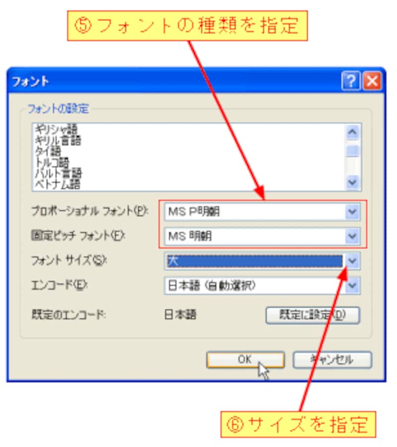 [フォント]ボタンをクリックすると、[フォント]ダイアログボックスが表示されますので、フォントの種類と大きさを指定します。