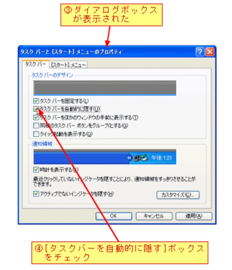 [プロパティ]をクリックすると、次のダイアログボックスが表示されますので、[タスクバーを自動的に隠す]ボックスをチェックします。