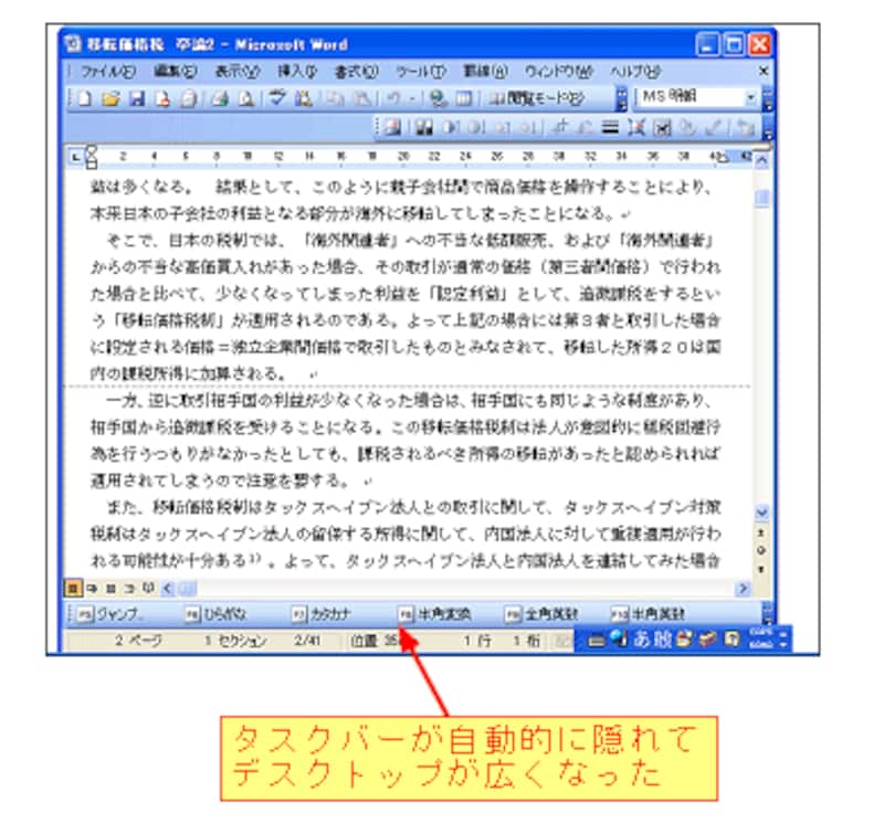 タスクバーが邪魔だと感じたら、自動的に隠すように設定しましょう。必要になったら、マウスポインタをタスクバーのあった位置に移動すると、再び表示されます。