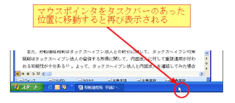 タスクバーを表示したいときは、マウスポインタをタスクバーのあった位置に移動します。