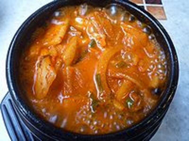 | 韓国の家庭料理キムチチゲ。ピリリと辛いですが、とても美味しいですよ! |