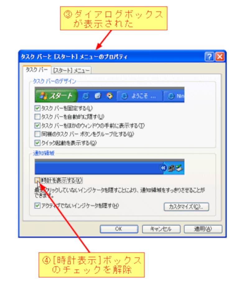 [プロパティ]をクリックすると、次のダイアログボックスが表示されますので、[時計表示]ボックスのチェックを解除します。