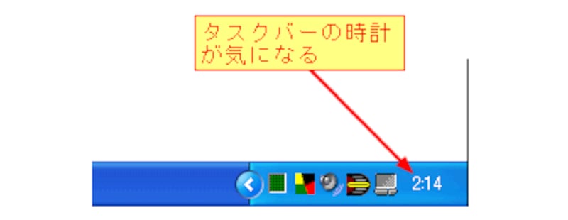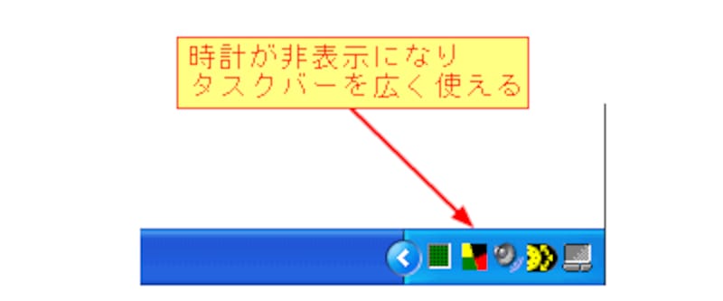 Windows の標準設定では、タスクバーの右端に時計が表示されています。たいへん便利なのですが、時計表示の分だけタスクバーが狭くなってしまうという欠点があります。