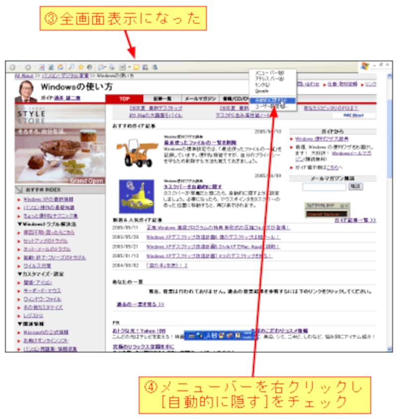 [表示]メニュー→[全画面表示]をクリックすると、Internet Explorerが全画面表示になります。さらに、メニューバーも隠したい場合は、メニューバーを右クリックし[自動的に隠す]をチェックします。