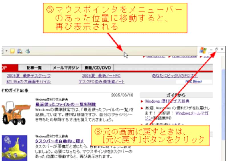 通常画面表示と全画面表示との切り替えは[F11]キーでも可能です。この場合、元に戻すときは、もう一度[F11]キーを押します。