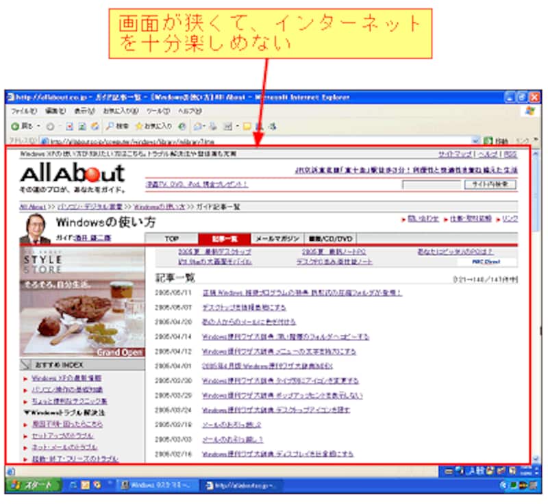 インターネットは広い画面でゆっくりとした気分で楽しみたいものです。しかし、ブラウザ画面には、タイトルバー、メニューバー、検索バー、ステータスバーなどがあり、意外とWebページの表示部分が狭いのに気がつきます。