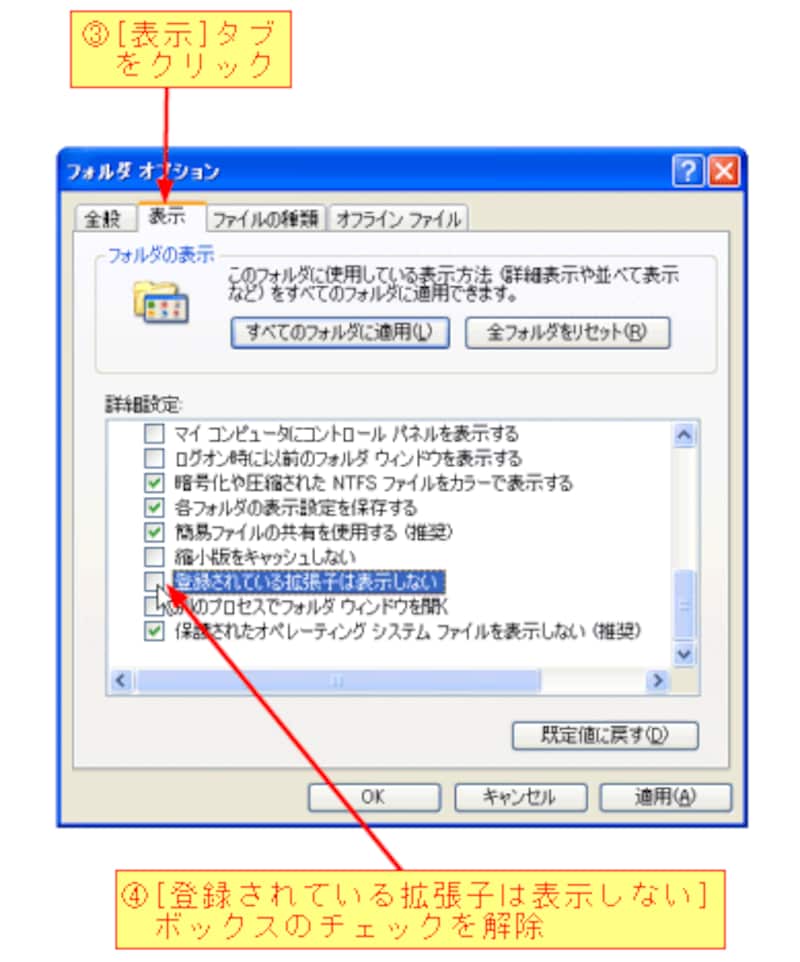 [フォルダオプション]をクリックすると、次のダイアログボックスが表示されます。ここで、[表示]タブをクリックし、[登録されている拡張子は表示しない]ボックスのチェックを解除します。