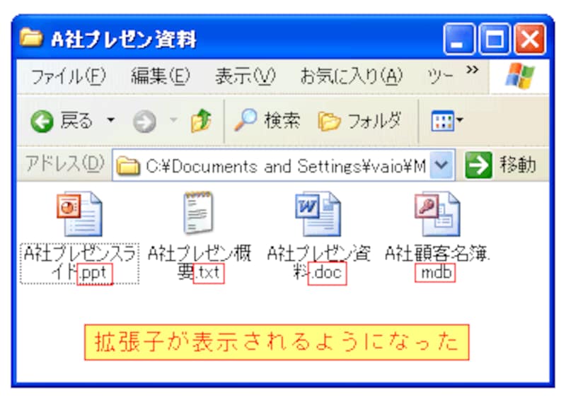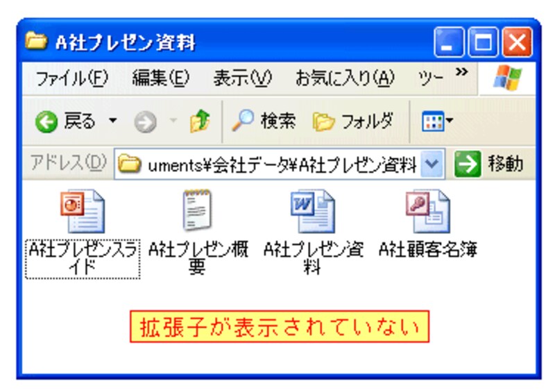 の標準設定では、拡張子は表示されません。これは、「ファイル名を変更するとき、誤って拡張子も同時に変更されないように…」との配慮のためと思われます。