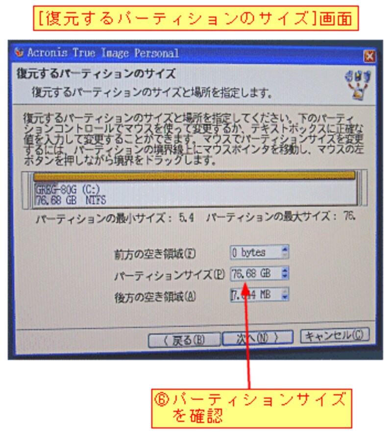 [次へ(N)>]ボタンをクリックすると、[復元するパーティションのサイズ]画面が表示される。今回は、バックアップしたパーティションをそのまま復元するので、パーティションサイズが同一であるかを確認する。