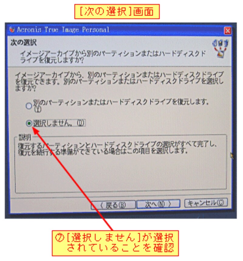 [次へ(N)>]ボタンをクリックすると、[次の選択]画面が表示される。イメージアーカイブから別のパーティションまたはハードディスクを復元しないので、[選択しません]が選択されていることを確認する。