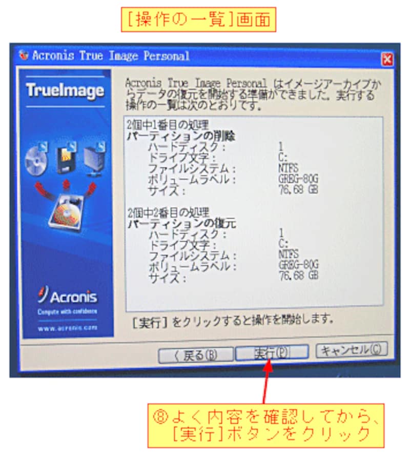 [次へ(N)>]ボタンをクリックすると、[操作の一覧]画面が表示される。よく内容を確認してから、[実行]ボタンをクリックする。
