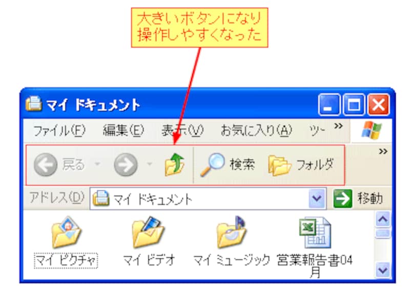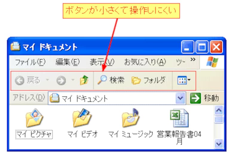 ディスプレイの解像度を高くしたときやB5サイズノートパソコンを使っていると、ツールバーのボタンが小さすぎて操作しにくい場合があります。以下の設定をすると、ツールバーのボタンを大きく表示できます。