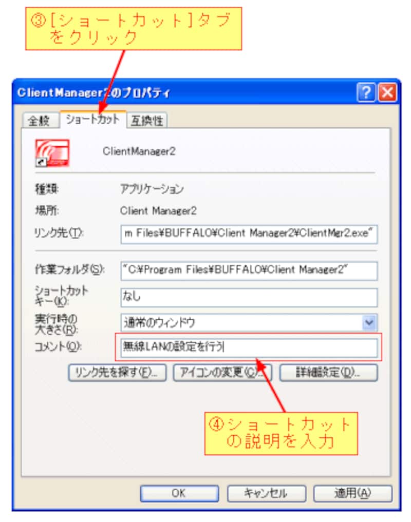 [プロパティ]をクリックすると、次のダイアログボックスが表示されます。ここで、[ショートカット]タブにある[コメント]ボックスにショートカットの説明を入力します。