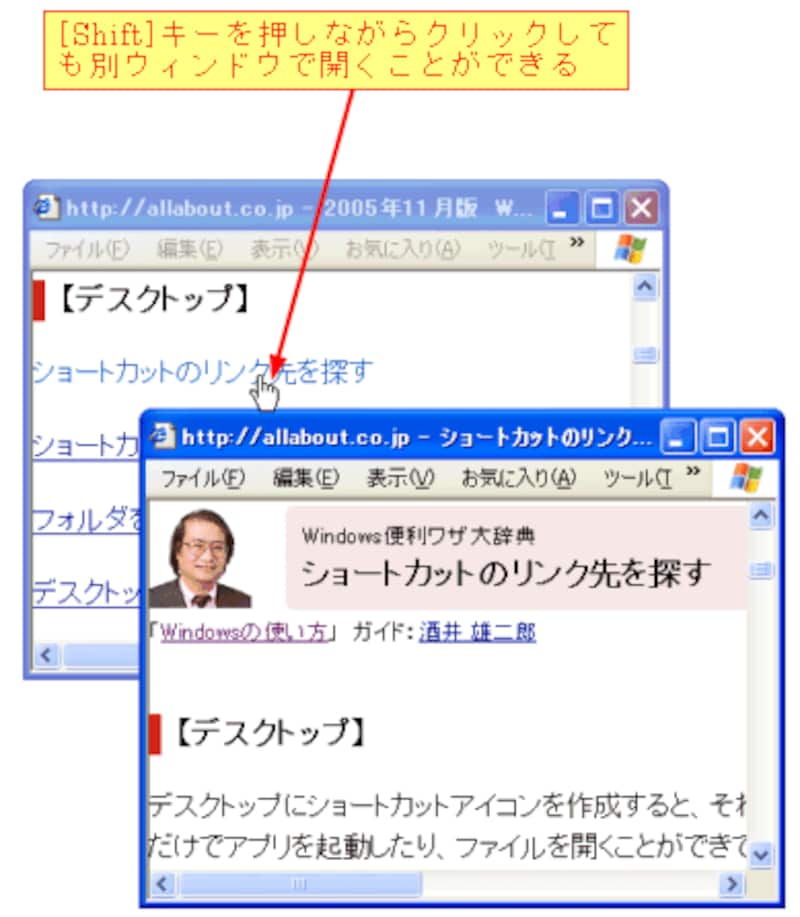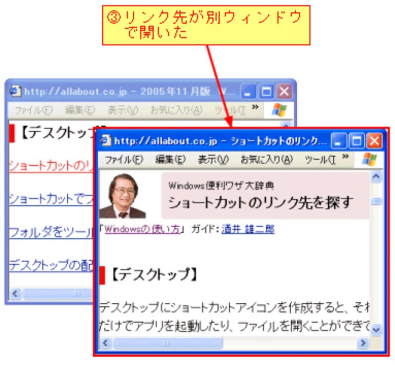 また、リンク上で[Shift]キーを押しながらクリックしても別ウィンドウで開くことができます。