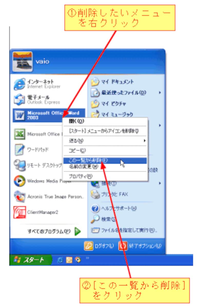 登録したメニューを削除したいときは、メニューを右クリックし[この一覧から削除]を選択します。