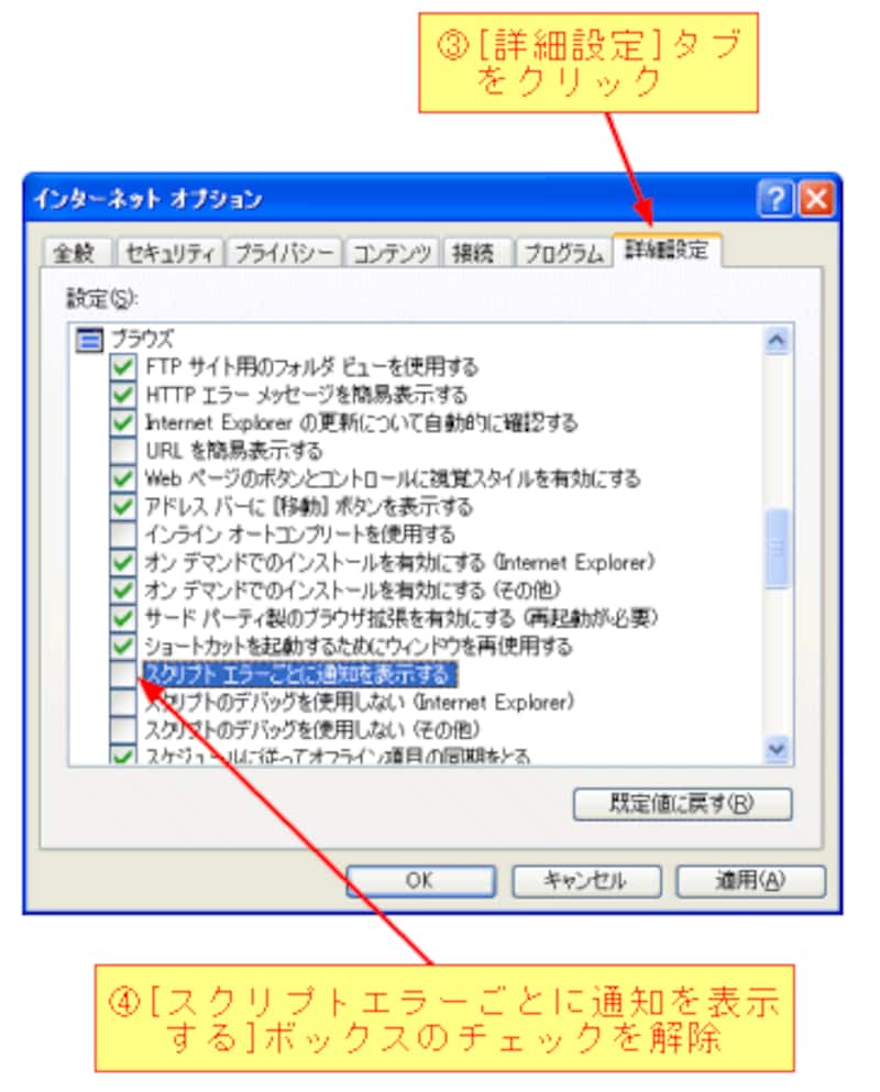 [インターネット オプション]をクリックすると、次のダイアログボックスが表示されますので、[詳細設定]タブの[スクリプトエラーごとに通知を表示する]ボックスのチェックを解除します。