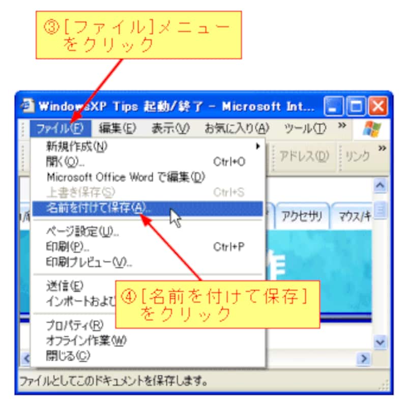 記録しておきたいWebページが表示されたら、[ファイル]メニュー→[名前を付けて保存]をクリックします。