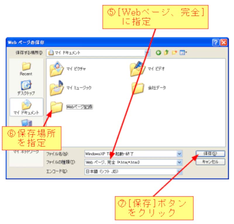 [Webページの保存]ダイアログボックスが表示されたら、[ファイルの種類]を[Webページ、完全]に指定して[保存]ボタンをクリックします。