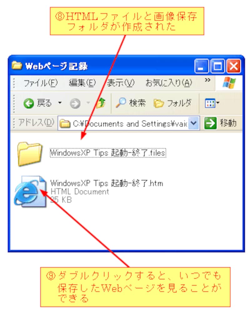 以上の方法で保存すると、HTMLファイルと画像ファイルが格納されたフォルダが作成されます。HTMLファイルをダブルクリックすると、いつでも保存したWebページを見ることができます。