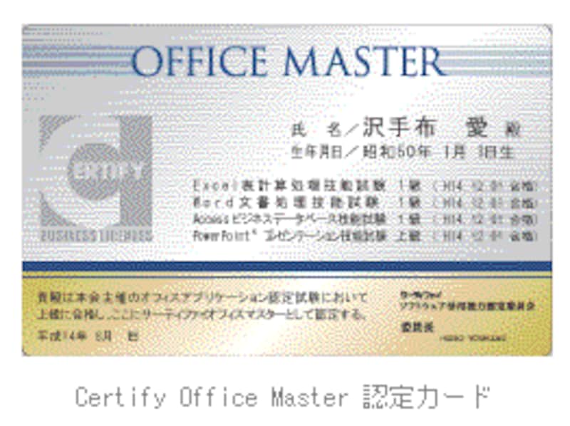さらに、この認定委員会が主催するMicrosoft Office系技能試験の全1級(上級)に合格すると、「Certify Office Master(サーティファイ・オフィス・マスター)」と認定され、以下のような認定証と認定カードを無料で発行してくれる。