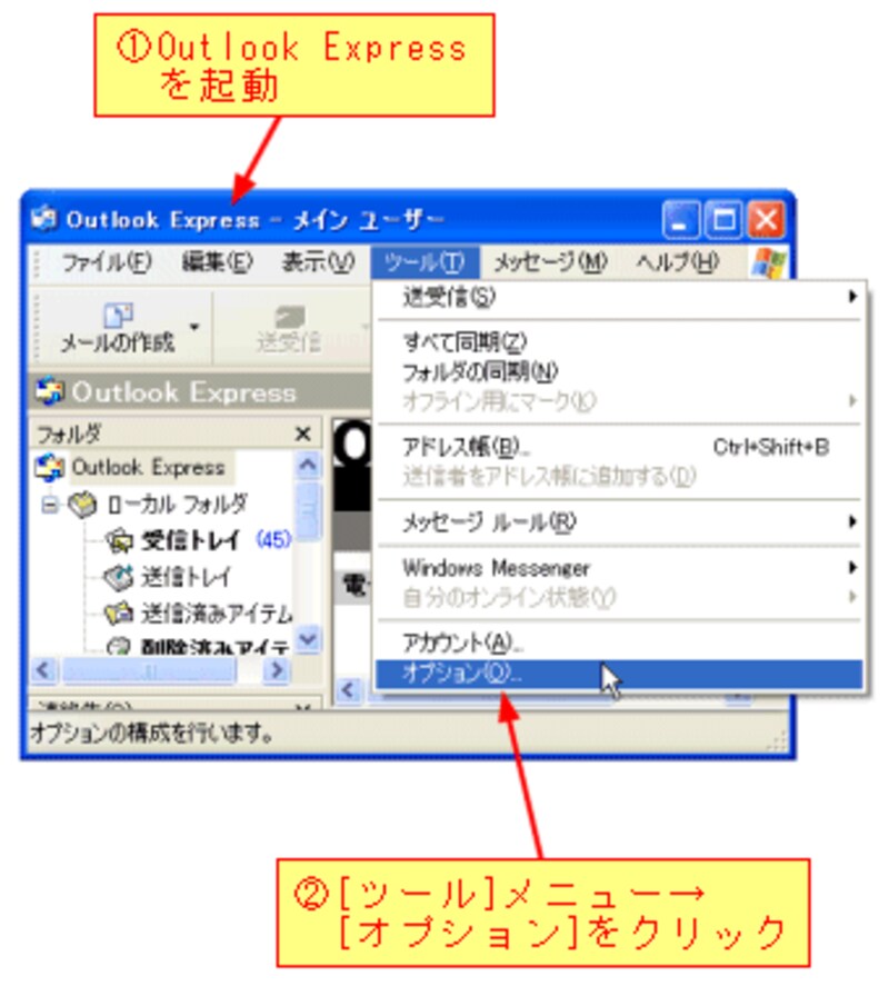 続いてOutlook Expressを起動し、[ツール]メニュー→[オプション]をクリックします。