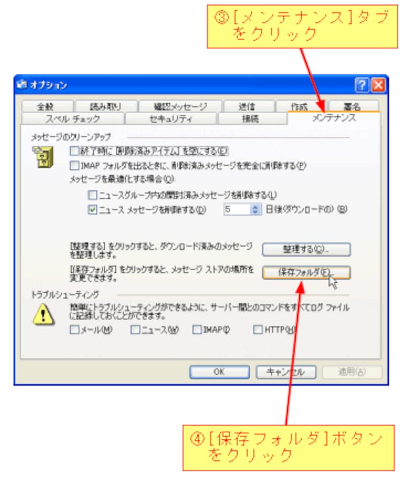 [オプション]をクリックすると、以下のダイアログボックスが表示されますので、[メンテナンス]タブを選択してから[保存フォルダ]ボタンをクリックします。