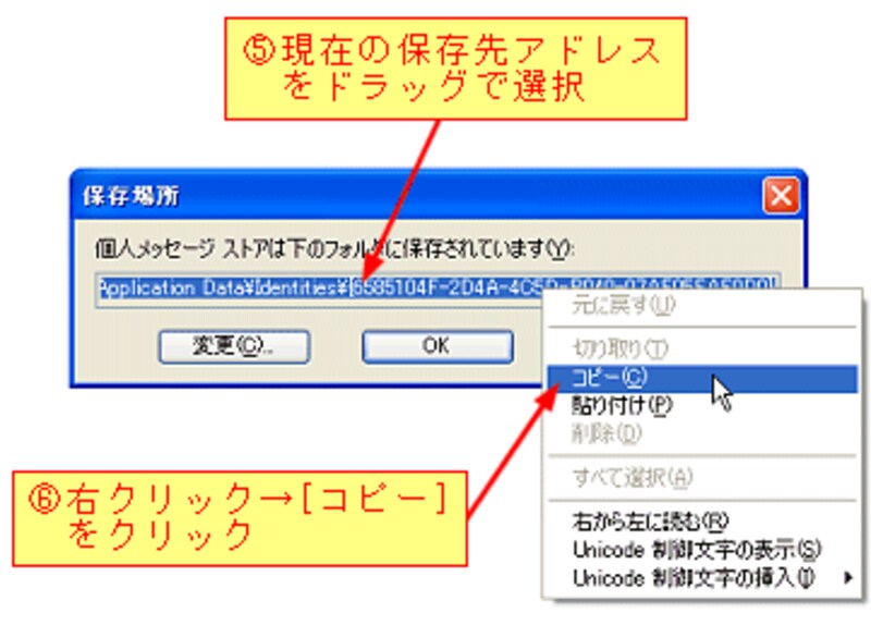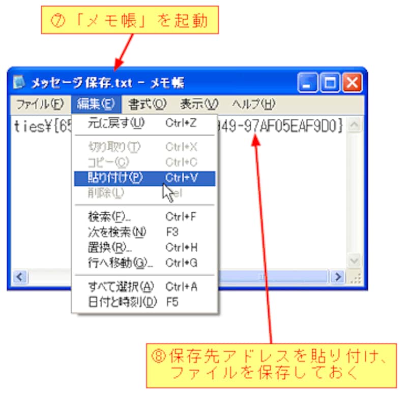 コピーした現在の保存先アドレスは、「メモ帳」を起動し、[編集]メニュー→[貼り付け]で貼り付け、ファイルとして保存しておいてください。この保存先アドレスは、元の状態に戻す場合に役に立ちます。