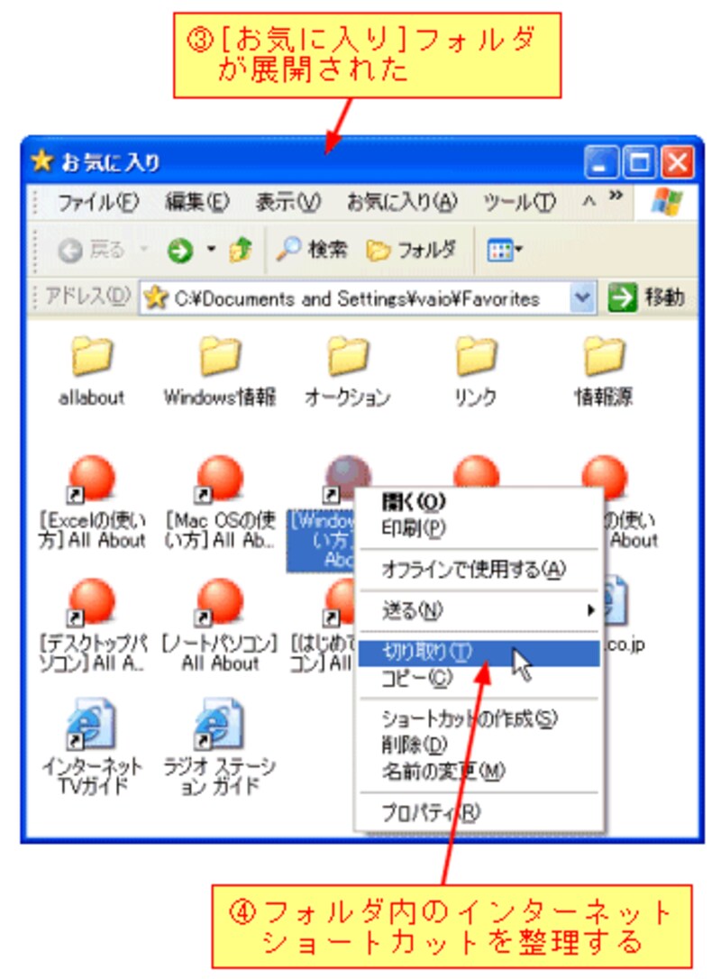 [お気に入りの整理]を[Shift]キーを押しながらクリックすると、[お気に入り]フォルダが展開されますので、フォルダ内のインターネットショートカットを整理します。