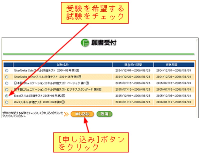 [OTS申し込み]をクリックすると、以下の画面が表示されるので、受験を希望する試験をチェックして[申し込み]ボタンをクリックする。