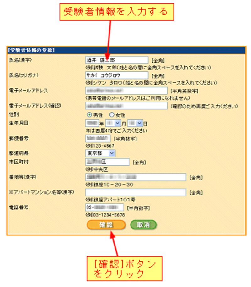 [申し込み]ボタンをクリックすると、以下の画面が表示されるので、受験者情報を入力する。
