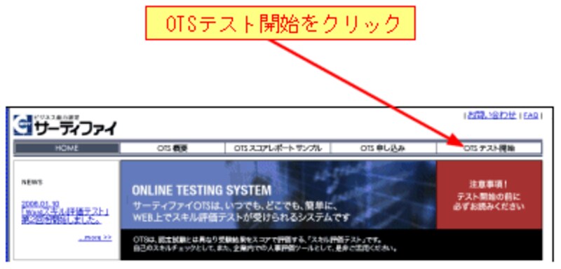 受験番号とパスワードを入手したら、もう一度[申し込み]画面を表示して、[OTSテスト開始]ボタンをクリックする。