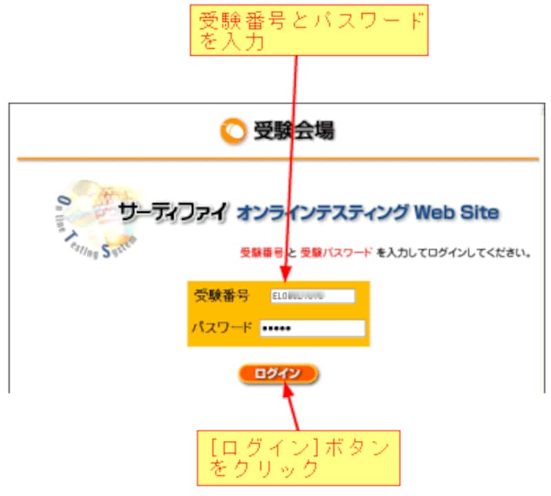 [OTSテスト開始]ボタンをクリックすると、[受験会場]画面が表示されるので、受験番号とパスワードを入力する。