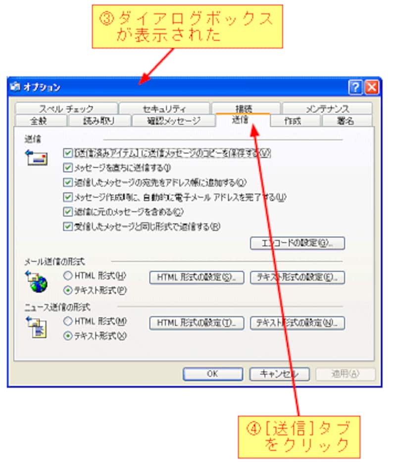 まず、Outlook Expressを起動し、[ツール]メニュー→[オプション]をクリックします。
