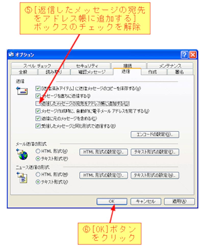 続いて、[送信]セクションにある[返信したメッセージの宛先をアドレス帳に追加する]ボックスのチェックを解除します。