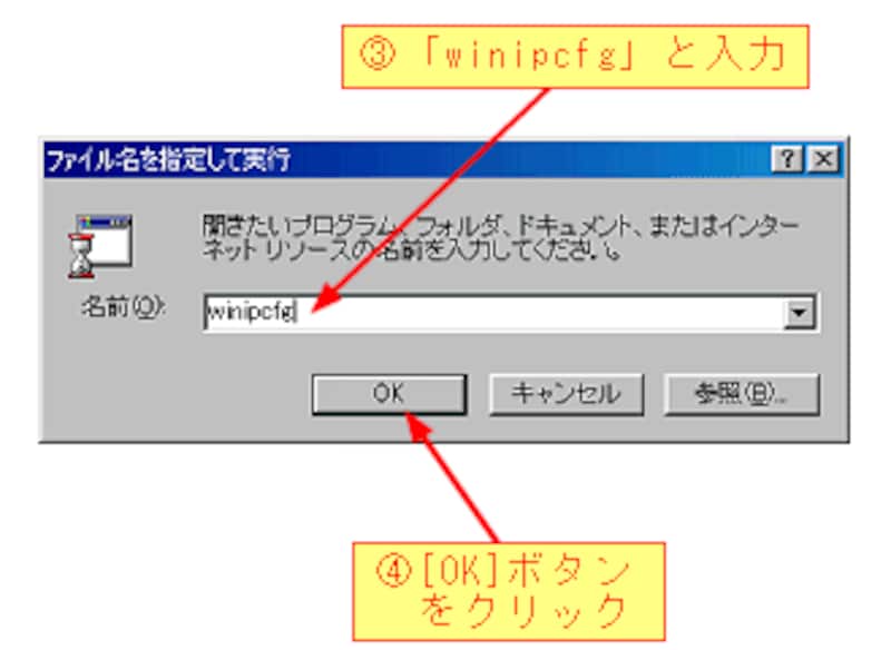 [ファイル名を指定して実行]ダイアログボックスが表示されたら、 [名前]ボックスに「winipcfg」と入力し[OK]ボタンをクリックします。