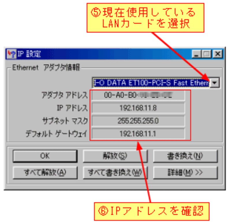 [OK]ボタンをクリックすると、[IP設定]ダイアログボックスが表示されますので、現在使用しているLANカードを選択すると、IPアドレスを確認できます。