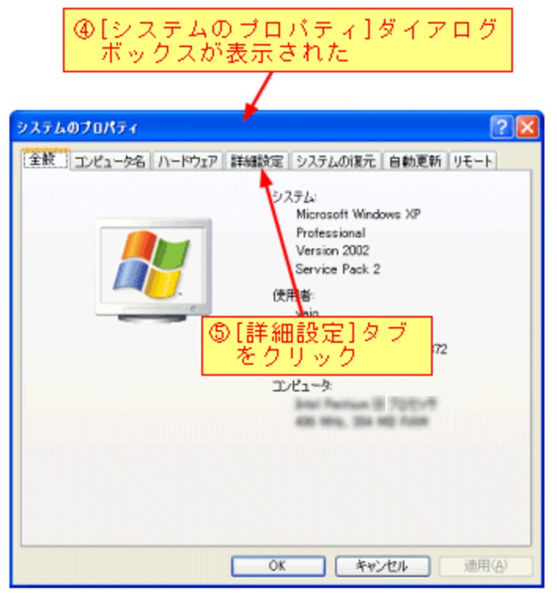 [プロパティ]をクリックすると、次の[システムのプロパティ]ダイアログボックスが表示されますので、[詳細設定]タブをクリックします。