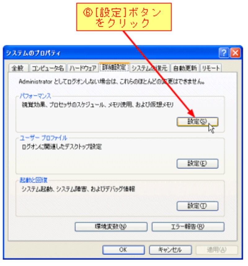 続いて、パフォーマンスセクションにある[設定]ボタンをクリックします。